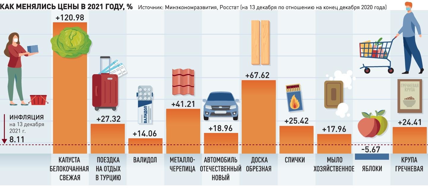 その点、こちらの記事に掲載された上掲の図は、ピンポイント的に品目を取り上げており、面白みがあった。2021年12月13日現在の各商品の価格が、前年暮れと比べてどれだけ値上がりしたかを見たものである。一番左に記されているのが消費者物価全体の8.11%であり、以下(チョイスが独特だが)、キャベツ、観光旅行、鎮静剤のバリドル、金属の屋根材、国産新車、製材、マッチ、家庭用石鹸、リンゴ、ソバの実と並んでいる。