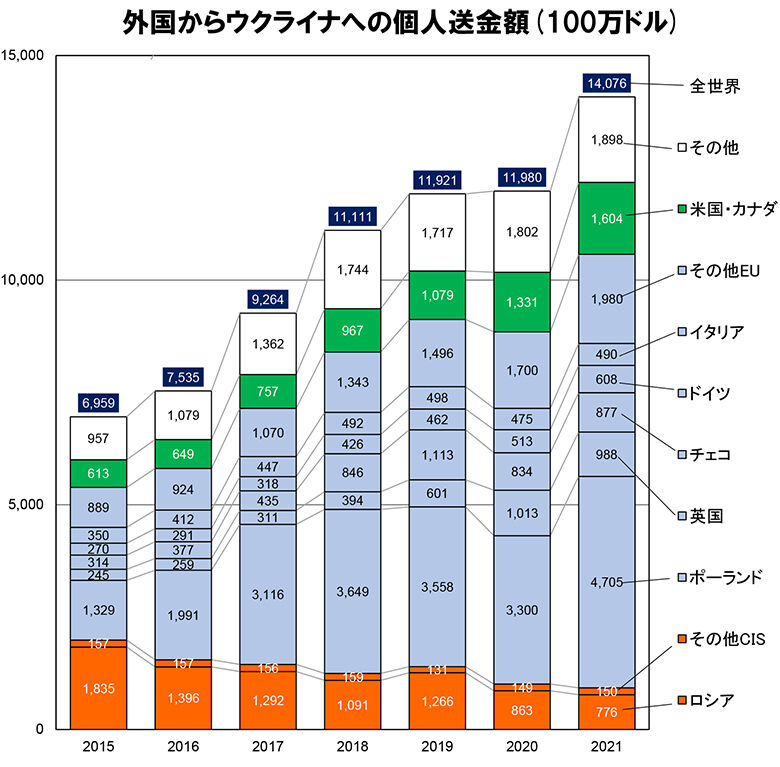 コロナ禍による2020年の足踏みこそあったものの、ウクライナ経済の出稼ぎ依存は深まる一方であった。2021年には、140億7,600万ドルを受け入れ、前年比17.5%拡大、過去最高を記録した。また、EU諸国(グラフでは青で示してあり、ここでは便宜的に英国も加える)からの受入比率が年々拡大しており、2021年にはそれが68.5%に達した。