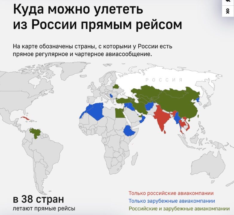 ロシアから直行便で行ける国の数は、38ヵ国だそうである。ただ、定期便だけでなくチャーター便も含むとされており、若干微妙な気がする。地図で赤の国がロシアの航空会社でのみ行ける国、青の国が外国の航空会社でのみ行ける国、緑が両方とも可能な国ということだ。