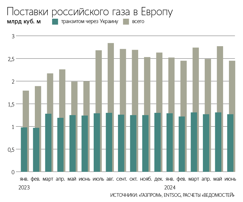 ロシアの全ルートによる欧州(EU諸国およびモルドバ)向けパイプラインガス輸出は、2024年1~6月に前年同期比27%増となり、154億立米となった。6月単月では23%増の25億立米であった。