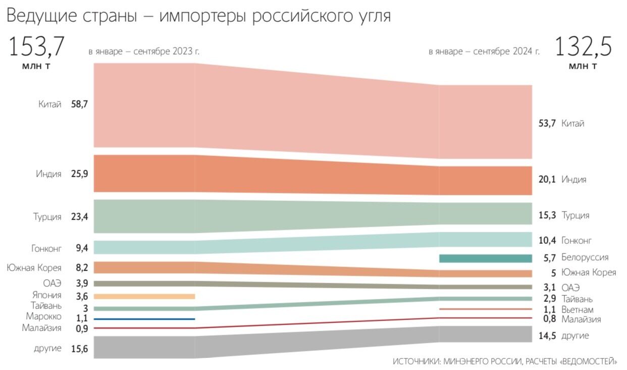 2024年1~9月の輸出量が1億3,250万tで、前年同期比17%減だった。うち、一般炭が1億830万tで17%減、原料炭が2,430万tで3%減だった。主な国への1~9月の輸出量は以下のとおり。
