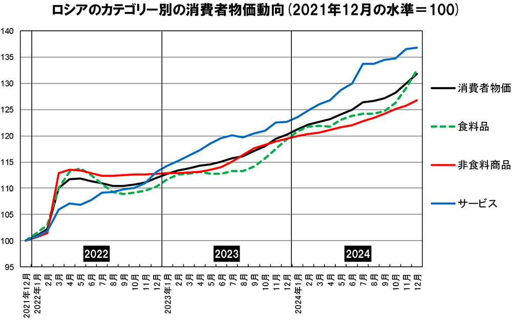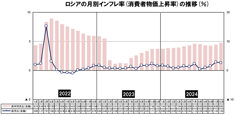 2024年12月のロシア消費者物価は、前月比1.32%増、前年同月比9.52%増だった。ここにきて食料商品の値上がりが顕著になっており、12月には前月比で2.60%もの上昇を示した。