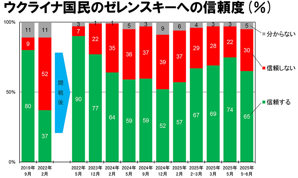 なお、2025年5月の調査で、ゼレンスキーの74%に次ぐ信頼を集めたのは、芸能界から政治家に転身したプリトゥラ(50%)、キーウ市長のクリチコ(43%)、オデーサ出身のキャスター/政治家のホンチャレンコ(27%)、与党「公僕党」から分かれ出たラズムコフ(27%)、前大統領のポロシェンコ(25%)などであった。