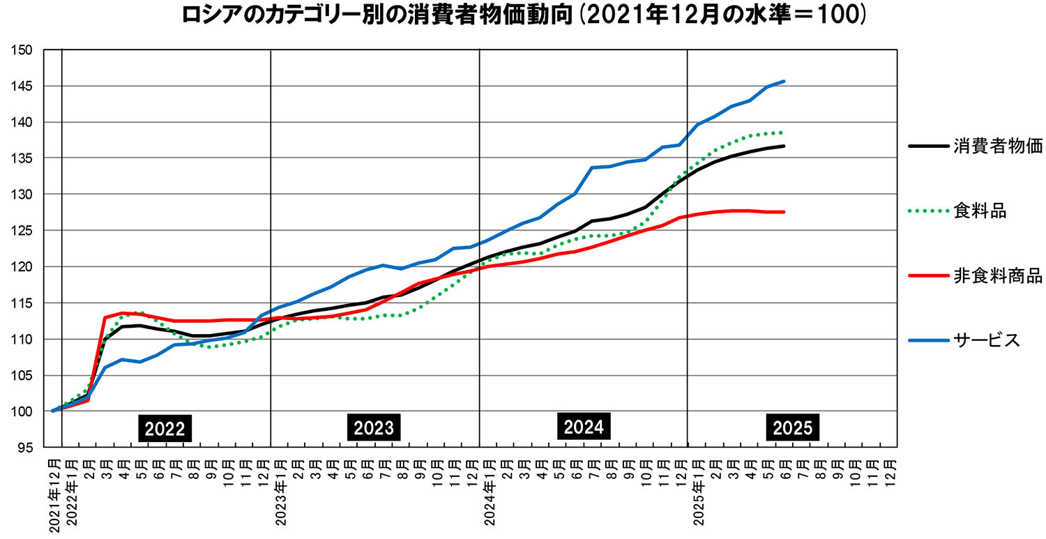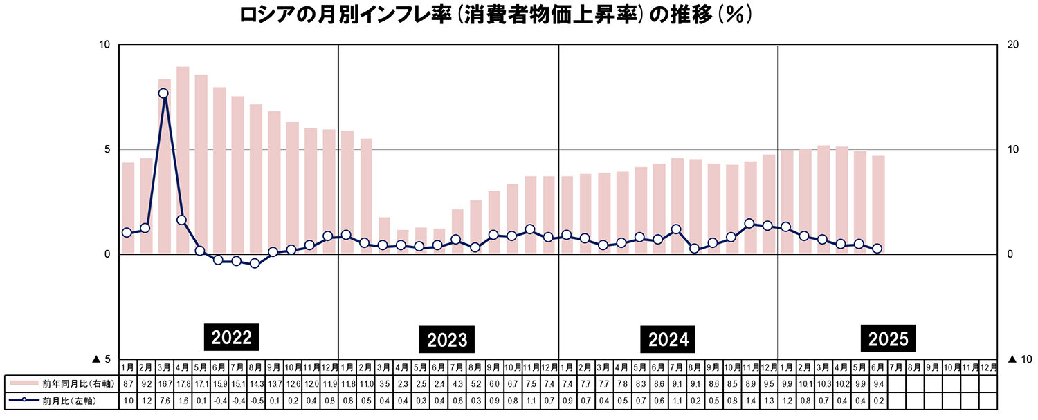 6月のロシアの消費者物価は、前月比0.20%増、前年同月比9.40%増であった。部門別では、このところサービスの値上がりが大きく、食料品は落ち着いてきており、非食料商品は横這いに近い状況となっている。