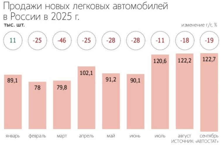 こちらの記事で、調査会社「アフトスタット」の数字に基づき、2025年1~9月のロシアの乗用車(新車)販売動向が伝えられているので、要点を整理しておく。