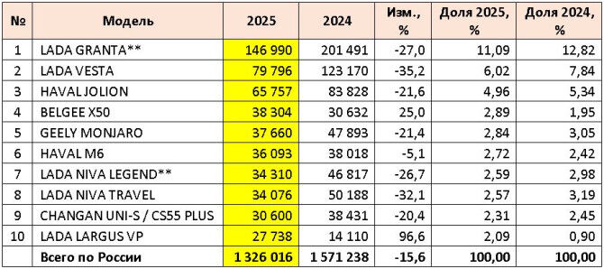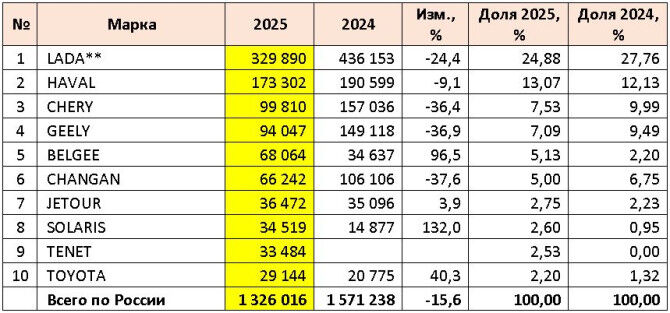 こちらのページに、Avtostatの集計による2025年のロシアにおける乗用車(新車)販売データが出ているので、紹介する。