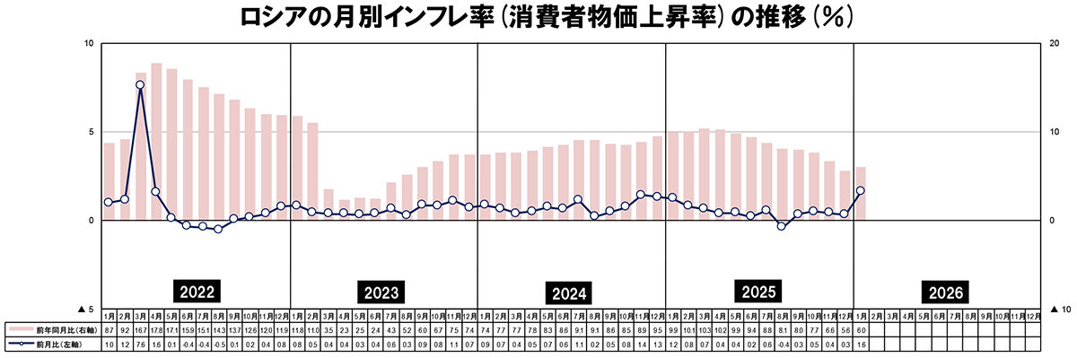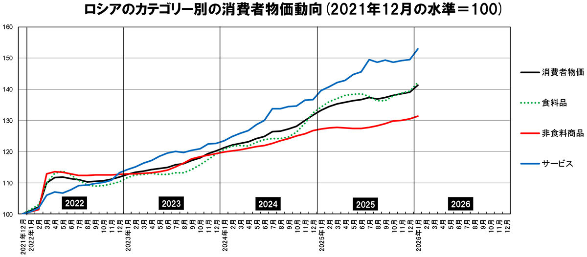 さらに、ロシアでは基本的に半期に一度、住宅・光熱水費などの公共料金が引き上げられることになっており、この1月はその引き上げも重なった。こちらの記事によれば、ロシア平均で1月に1.7%の引き上げがあったということである。