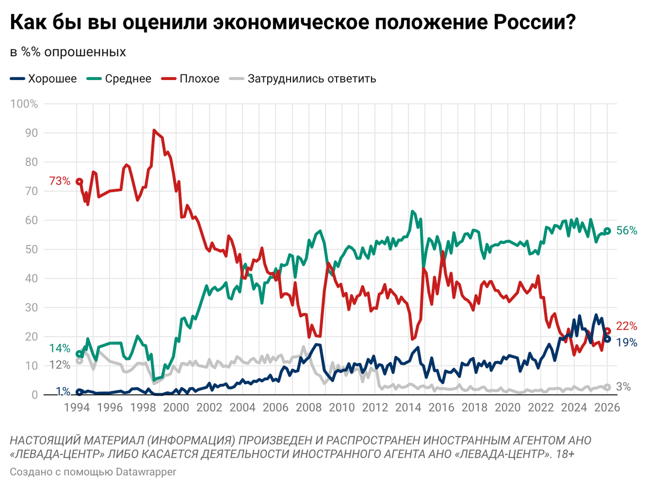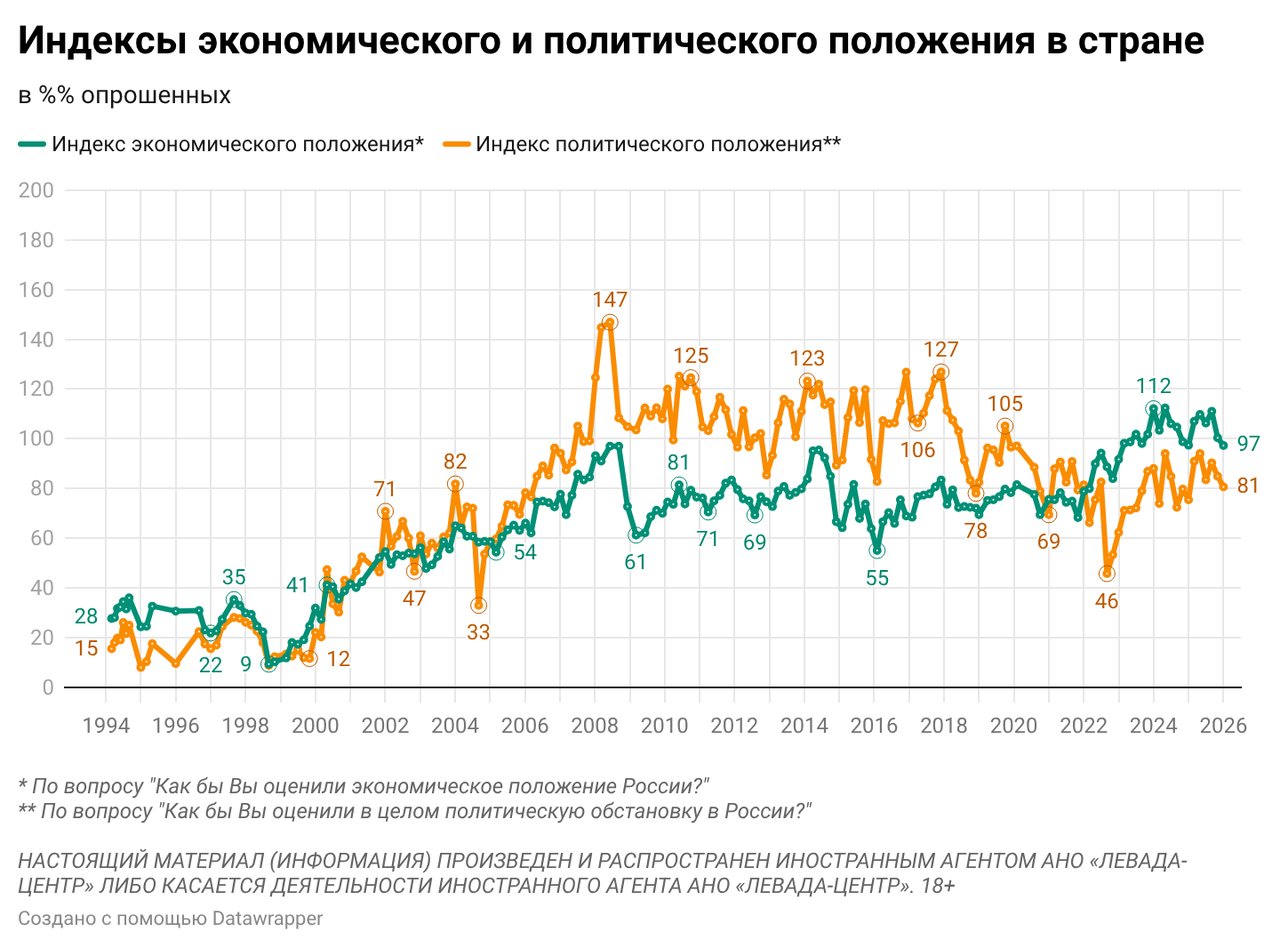 レヴァダ・センターのこちらの調査結果が興味深かったので、取り上げてみたい。ロシア国民が自国の経済・政治状況をどのように評価しているかという長期的な調査であり、2026年1月の直近の調査結果までが反映されている。