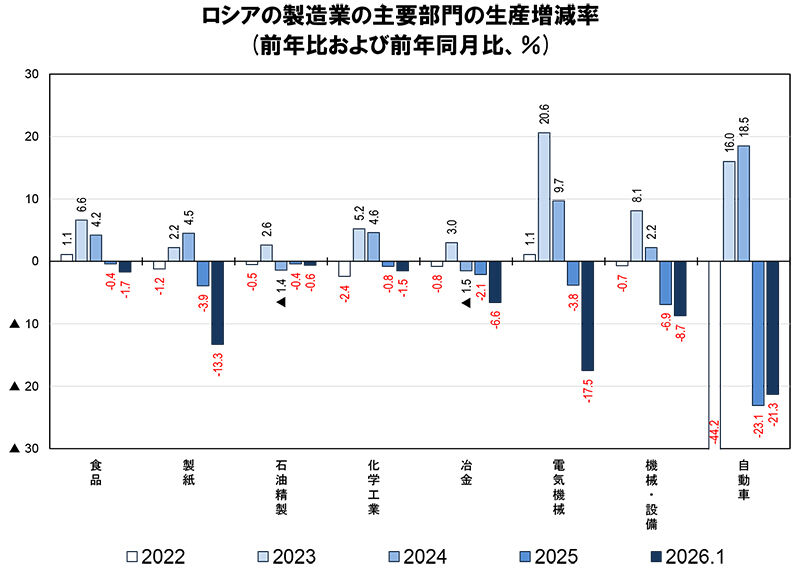 上図に見るとおり、2022年の侵攻開始以来、ロシアでは本来の花形である鉱業が制裁などで低迷し、製造業が全体を引っ張る構図となっていた。しかし、製造業は2025年には3.6%増へと鈍化し、2026年1月にはついに3.0%減とマイナスに転じたため、鉱工業全体も0.8%のマイナスを余儀なくされた。逆に鉱業は0.5%増と若干上向いた。