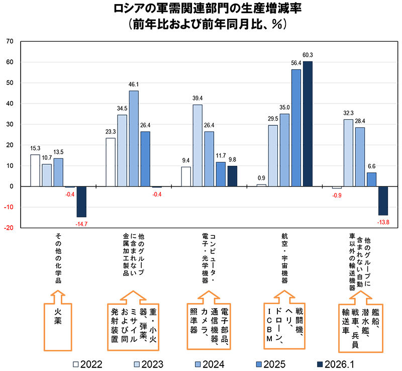 つまり、製造業が牽引していると言っても、民需・外需という一般向けの基幹産業は、2025年の時点ですでに大不振だったのである。それでも製造業が伸びていたのは、軍需の伸びによるものであった。しかし、その軍需も、おそらくはドローン増産に支えられた航空・宇宙機器を除くと、2025年には伸びが鈍化し、2026年に入りさらに不振を色濃くしている。