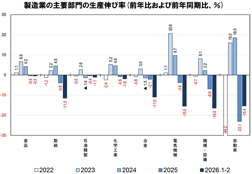 鉱工業全体と、その二本柱である鉱業および製造業の生産指数を見たのが、上図となる。2025年までは製造業が牽引する形で鉱工業全体が伸びていたが、2026年に入り製造業に急ブレーキがかかり、1~2月には製造業は前年同期比2.9%減を記録した。逆に、マイナスが続いていた鉱業は、今年に入り若干持ち直している。