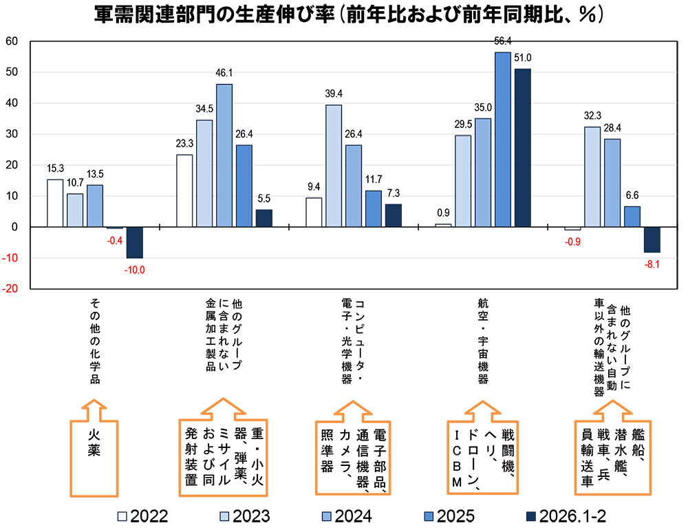 それでも2025年まで製造業が全体としてプラスだったのは、軍需生産の増産によるものに他ならない。しかし、下図に見るとおり、その軍需関連部門も、今年に入り減産や伸び率の鈍化に直面している。