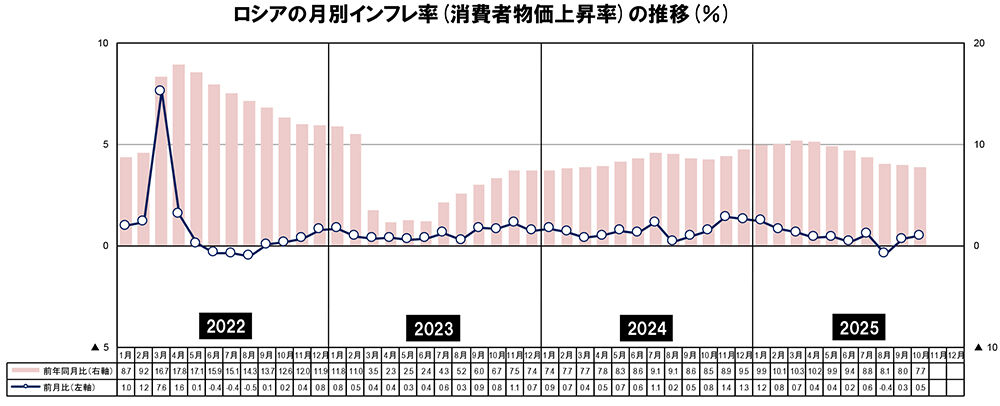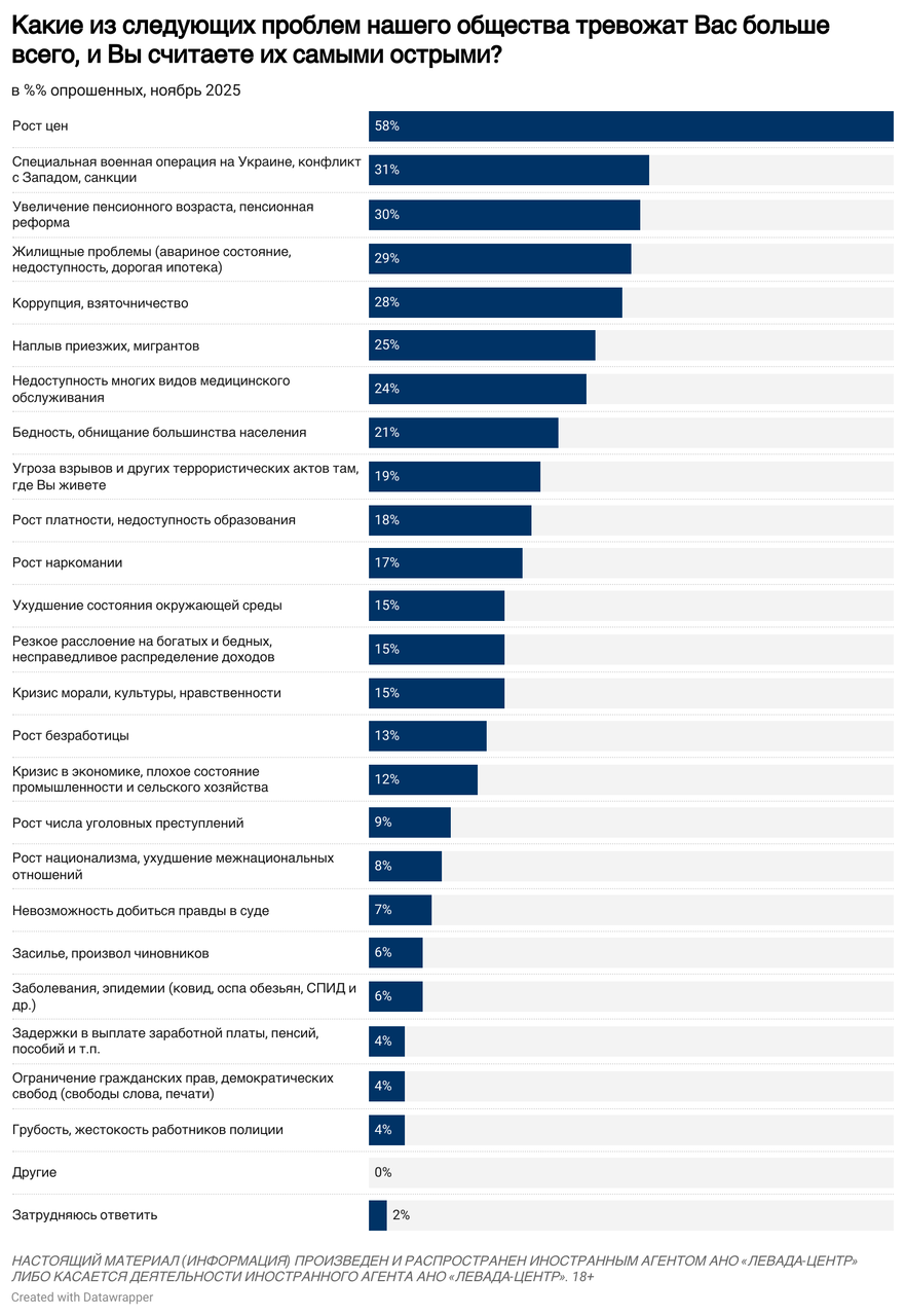 こちらのページに見るとおり、ロシアのレヴァダ・センターが11月の全国世論調査で、最も憂慮する問題は何かということを複数回答で問うている。その回答状況が上図のとおりである。日本語に訳すと、以下のとおりとなる。やはり物価高が一番の悩み。ウクライナ情勢も当然憂慮の的ではあるが、特別軍事作戦、西側との対立、制裁と回答の選択肢を分けた方がいいような気もする。