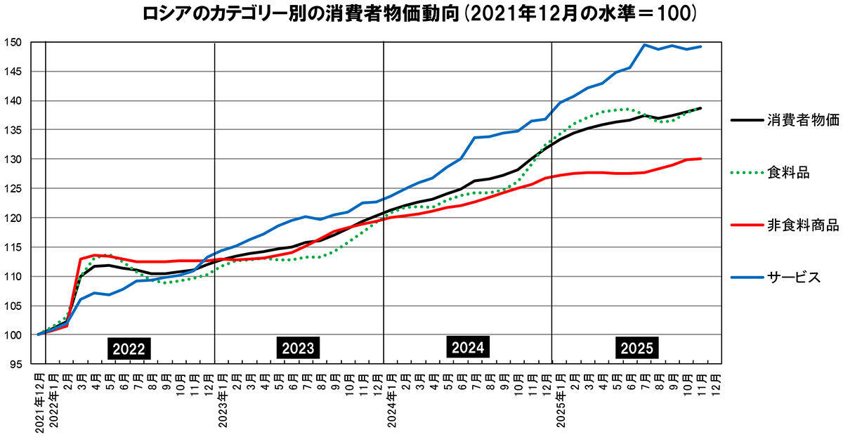 消費者物価を食料品、非食料商品、サービスに分けて、侵攻開始以降の水準推移を跡付けたのが、下図となる。11月には食料品の値上がりが目立ったが、冬の足音が近付くにつれ食べ物が高くなるのは、毎年のことである。