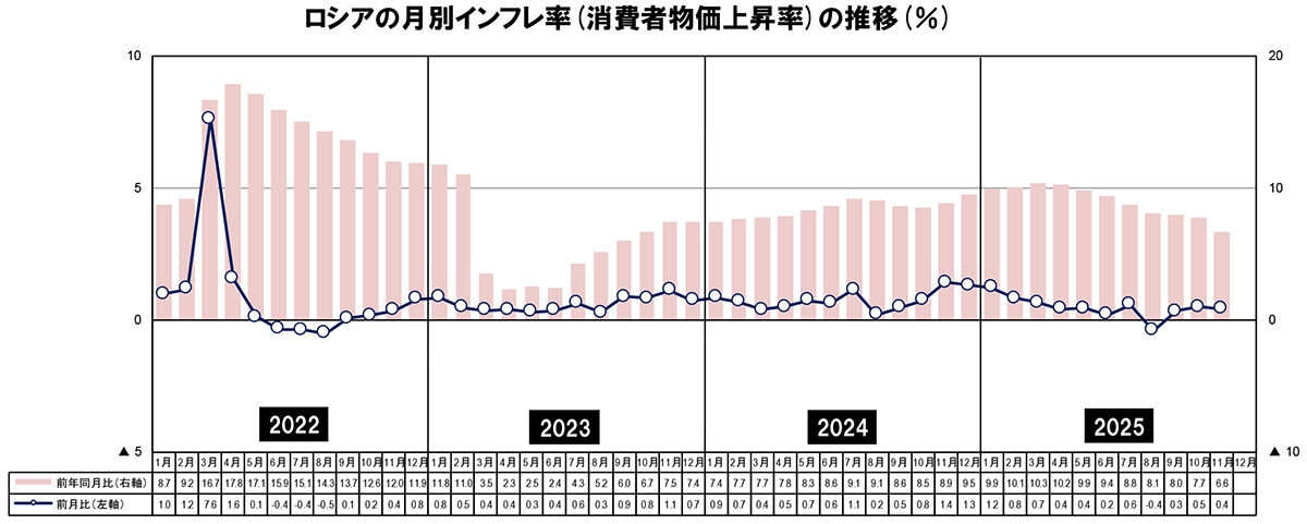 11月の消費者物価は、前月比0.42%増、前年末比5.25%増、前年同月比6.64%増だった。一頃は「加熱」とまで言われた景気が2025年に入り悪化し、そうした中で引き続き高金利となっていることで、さすがに物価も沈静化してきたか。なお、注目のガソリン価格は、11月には前月比で0.85%下落した。