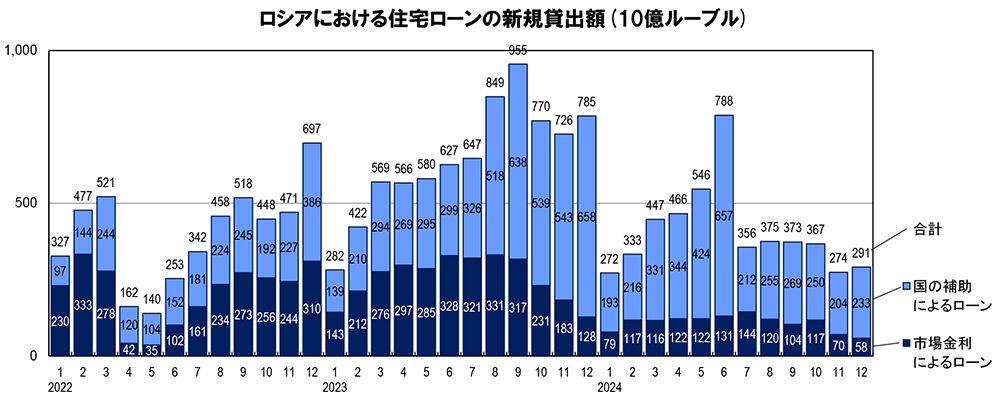 昨年7月以降はこれらの条件付き優遇ローンだけになったので、上図に見るとおり、昨年6月の駆け込み利用を過ぎると、7月以降国の補助による優遇ローン利用は低下し、これに伴い住宅ローン全体も低下した。2024年全体でも、住宅ローンの貸し出しは4.9兆ルーブルに留まり、前年比37%低下した。