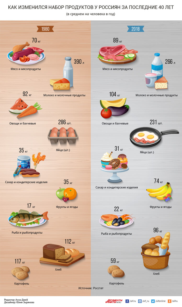 ブログのネタに困った時に使わせてもらう『論拠と事実』紙のウェブサイトに出ている図解資料。今回は、こちらのページに、1980年と2018年で、ロシア国民の主要食品の消費量がどう変わったかを示した図を取り上げてみる。